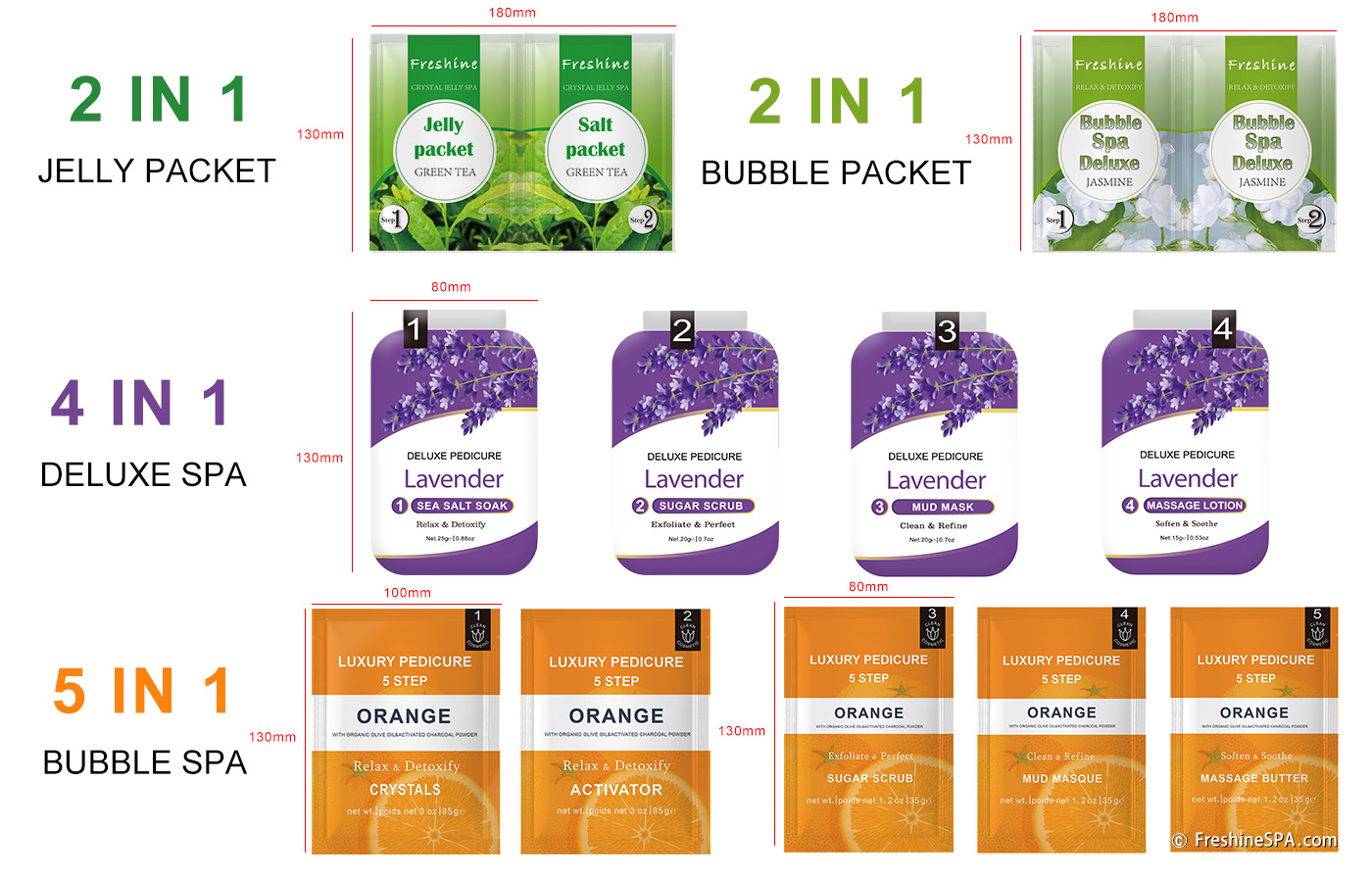 We have 24 popular scents: Lavender, Orange, Jasmine, Peppermint, Cucumber, Green Tea, Rose, Mango, Tropical Fruit, Lemon, Pearl Honey, Honey Milk or custom Golden SPA.